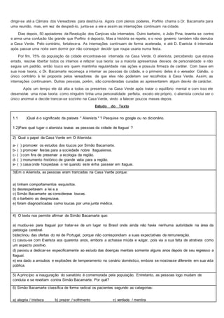O documento resume a história do livro "O Alienista", de Machado de Assis. Conta a história do Dr. Simão Bacamarte, que constrói um manicômio chamado Casa Verde para estudar a loucura, mas acaba internando grande parte da população da cidade. No final, Bacamarte conclui que o único anormal é ele próprio e se interna sozinho na Casa Verde, onde vem a falecer.