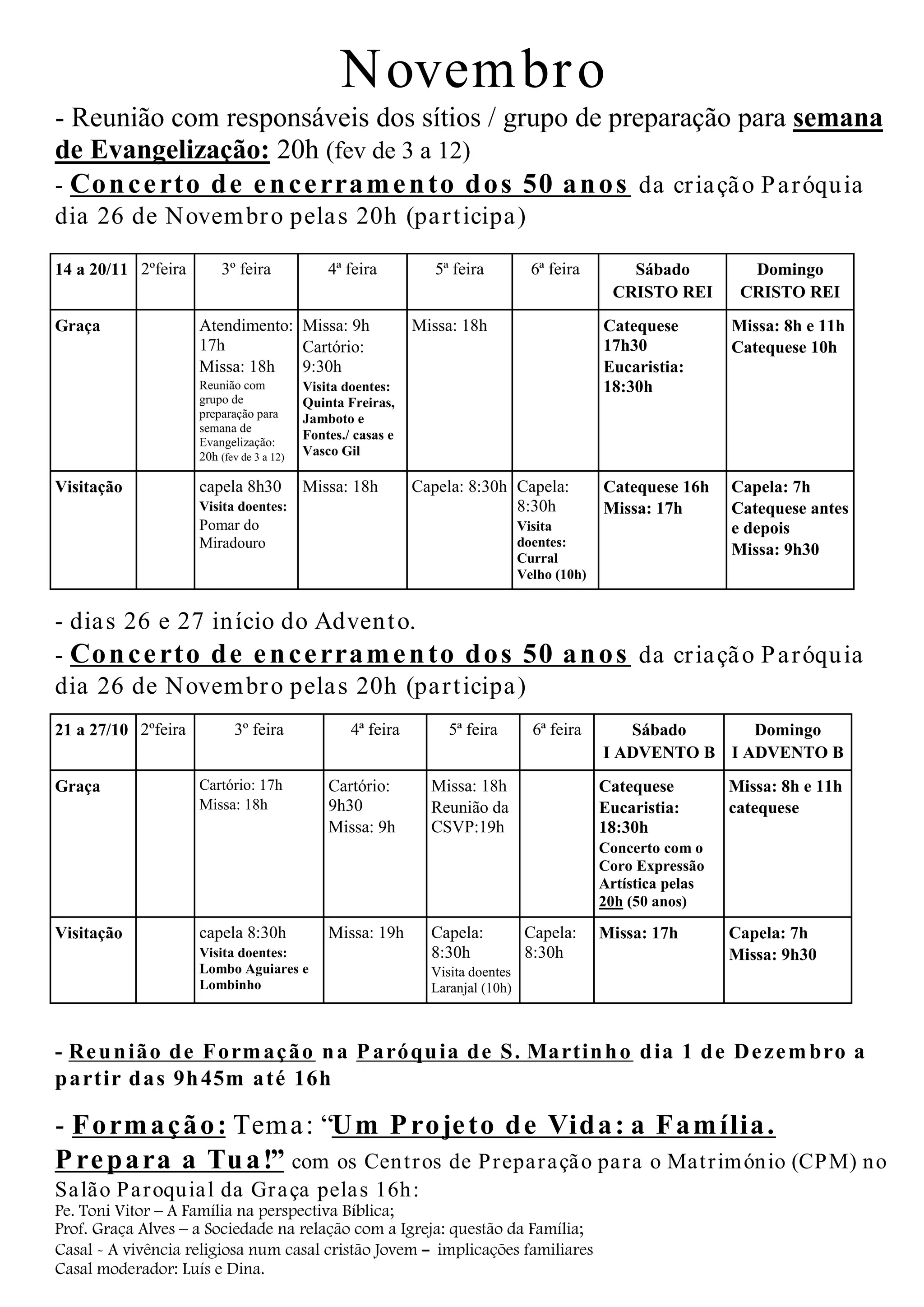 (1) Reunião com responsáveis dos sítios para preparação da Semana de Evangelização em 20 de novembro. (2) Concerto de encerramento dos 50 anos da criação da Paróquia em 26 de novembro às 20h. (3) Reunião de Formação na Paróquia de São Martinho em 1 de dezembro sobre o tema "Um Projeto de Vida: a Família."