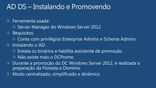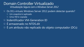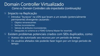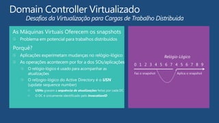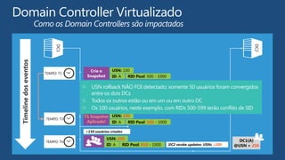 O documento discute desafios de replicação entre controladores de domínio e como evitar a reutilização de números de sequência de alteração (USN) para garantir a convergência correta entre controladores após falhas. Ele também fornece links para artigos da Microsoft e de um blog que abordam esses tópicos.