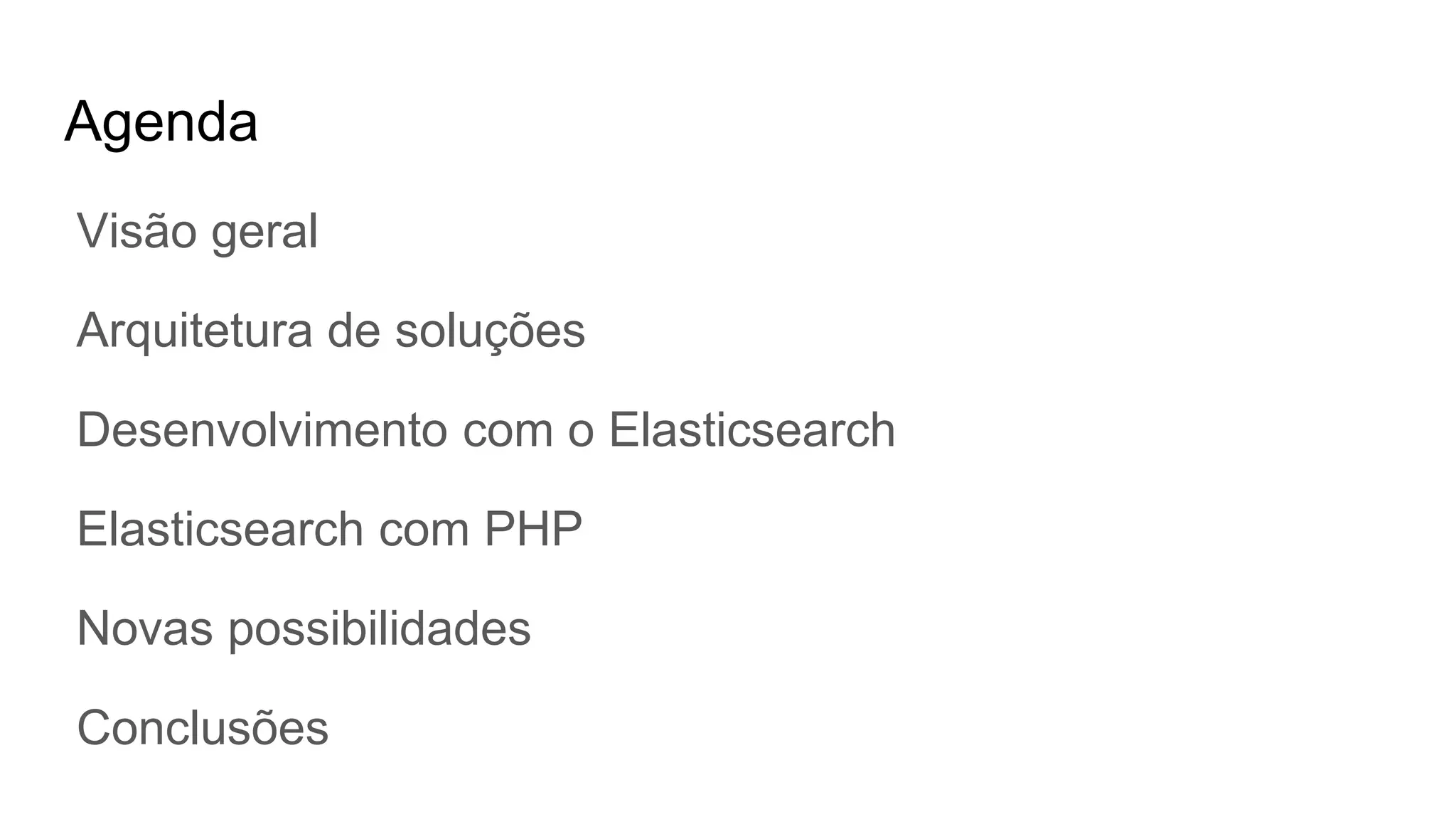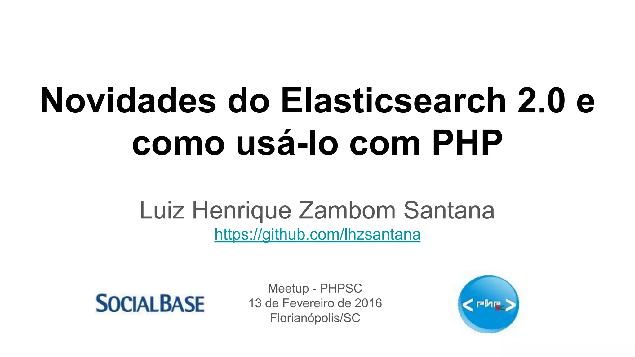 O documento apresenta uma visão geral do Elasticsearch 2.0 e como usá-lo com PHP. As principais seções incluem: (1) visão geral do Elasticsearch, sua arquitetura e uso, (2) desenvolvimento com o Elasticsearch, incluindo indexação, busca e agregações, (3) uso do cliente PHP para interagir com o Elasticsearch, realizando operações como indexação, busca e sugestão.