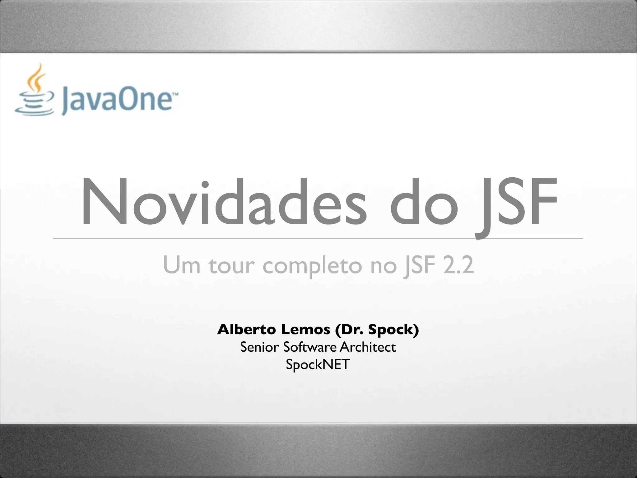 O documento apresenta as principais novidades do JSF 2.2, incluindo seis grandes funcionalidades (HTML5 Friendly Markup, Faces Flows, Cross Site Request Forgery Protection, Upload de Arquivos, Carga de Facelets via ResourceHandler e Multi-templating) e 28 funcionalidades médias e 44 correções de defeitos menores. O projeto ScrumToys é apresentado como uma oportunidade para a comunidade contribuir com o desenvolvimento do JSF 2.2.