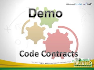 Code Contracts Melhora os testes Analizador Estático Dinâmico Melhora documentação System.Diagnostics.Contracts Compilado condicionalmente Qualquer linguagem Precisa de um Add-in para funcionalidade completa PEX é um excelente complemento