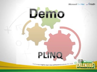 Parallel LINQ ParallelLINQ (PLINQ) nos permite utilizar facilmente todo o poder de múltiplos núcleos com um impacto mínimo no LINQ que já usamos var q = from p in people where p.Name == queryInfo.Name && p.State == queryInfo.State && p.Year >= yearStart && p.Year <= yearEnd orderby p.Year ascending select p;