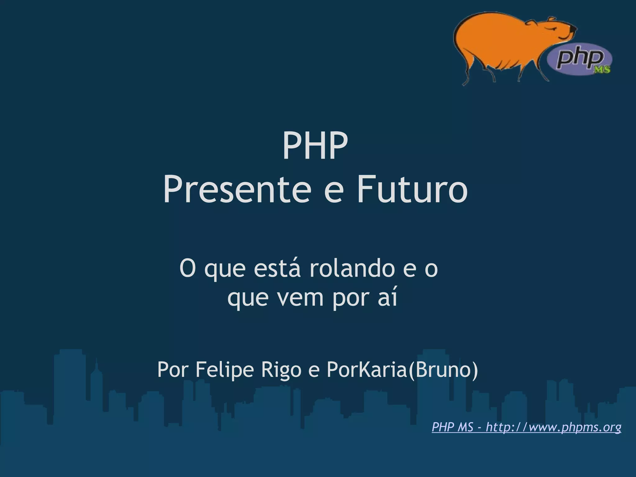 O documento resume as principais informações sobre o presente e futuro da linguagem PHP. No presente, o PHP tem mais de 20 milhões de sites, é o módulo Apache mais popular e teve sua última versão estável lançada em 2008. No futuro, versões como a 5.3 trarão melhorias de desempenho e recursos como namespaces, MySQLInd e garbage collector, enquanto a versão 6 removerá recursos como magic_quotes e register_globals e trará suporte nativo a Unicode.