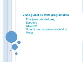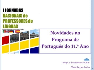 Este documento apresenta as novidades no Programa de Português do 11o ano, descrevendo os principais domínios, objetivos, conteúdos e metas. Inclui informações sobre oralidade, leitura, escrita, educação literária e gramática. Defende uma abordagem integrada destas áreas para valorizar as dimensões cultural, literária e linguística da língua portuguesa.