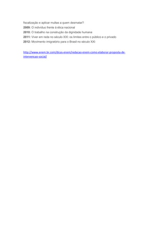 Este documento discute como elaborar uma proposta de intervenção social para a redação do Exame Nacional do Ensino Médio (Enem). Ele explica que o Enem avalia a habilidade de propor soluções para problemas sociais abordados e que as propostas devem ser factíveis, respeitar direitos humanos e se adequar à realidade brasileira. Também fornece exemplos de temas de redação anteriores relacionados a questões sociais.