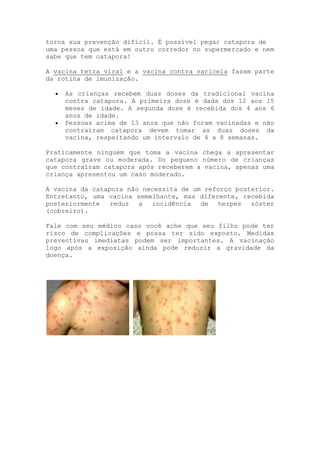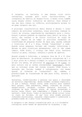 A catapora é uma doença viral altamente contagiosa causada pelo vírus varicela-zóster, caracterizada por pintinhas vermelhas que evoluem para bolhas de água e posteriormente "casquinhas"; pode ser transmitida antes dos sintomas aparecerem e tem maior risco para gestantes, recém-nascidos e pessoas com baixa imunidade. A vacina contra catapora faz parte da rotina de imunização infantil e é altamente eficaz na prevenção da doença.