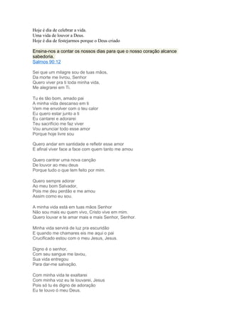 O documento celebra a vida como um dom de Deus, ensinando-nos a contar cada dia como sabedoria. Exalta a Deus como bom Pai e Salvador que deu sua vida para nos dar perdão e salvação. Expressa o desejo de viver em santidade, louvando e servindo a Deus com gratidão pelo seu amor.