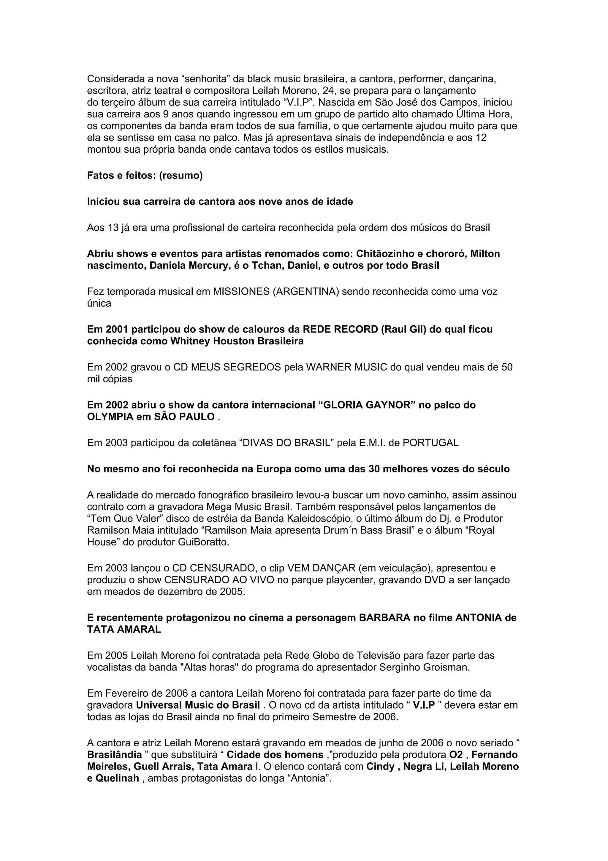 Leilah Moreno é uma cantora e atriz brasileira de 24 anos que iniciou sua carreira musical aos 9 anos de idade. Ela lançará em breve seu terceiro álbum, intitulado "V.I.P". Ao longo de sua carreira, Leilah Moreno se apresentou com diversos artistas renomados e gravou vários álbuns que venderam milhares de cópias.