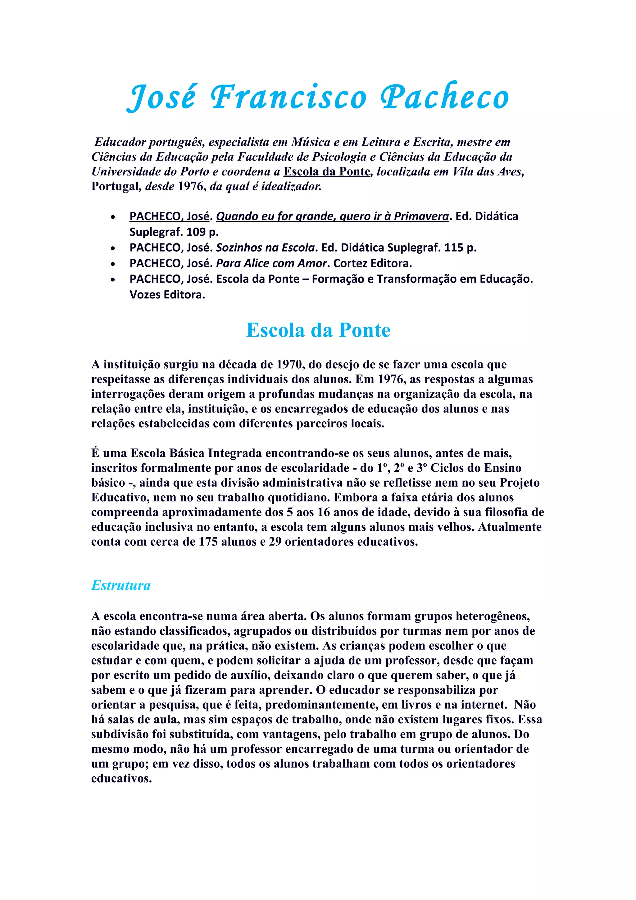 José Francisco Pacheco é um educador português especialista em música e leitura/escrita. Ele coordena a Escola da Ponte desde 1976, uma escola básica integrada sem turmas ou séries tradicionais. Os alunos escolhem o que aprender de forma autônoma, elaboram seus próprios planos de estudo e desenvolvem projetos individuais ou em grupo com a ajuda dos professores quando solicitada.