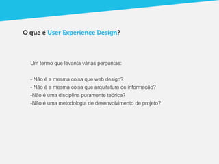 O documento discute como o User Experience Design (UXD) pode ser uma ferramenta útil para as empresas ao ajudá-las a aumentar as vendas, criar valor para os clientes e alcançar seus objetivos gerais. Apesar de seu potencial, poucas empresas entendem completamente o UXD devido à dificuldade de categorizá-lo sob os tradicionais modelos de marketing. Uma abordagem baseada no UXD pode transformar toda a empresa e os produtos ao considerar a jornada completa do usuário.