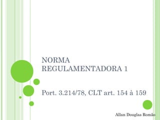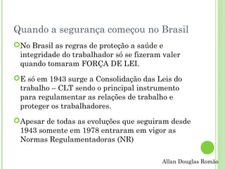 A Norma Regulamentadora 1 estabelece os requisitos técnicos e legais sobre os aspectos mínimos de Segurança e Saúde Ocupacional no Brasil. As Normas Regulamentadoras, publicadas em 1978, são elaboradas por uma comissão tripartite e aplicam-se a todas as empresas e instituições regidas pela CLT. Empregadores e empregados têm responsabilidades específicas para garantir a saúde e segurança no trabalho.
