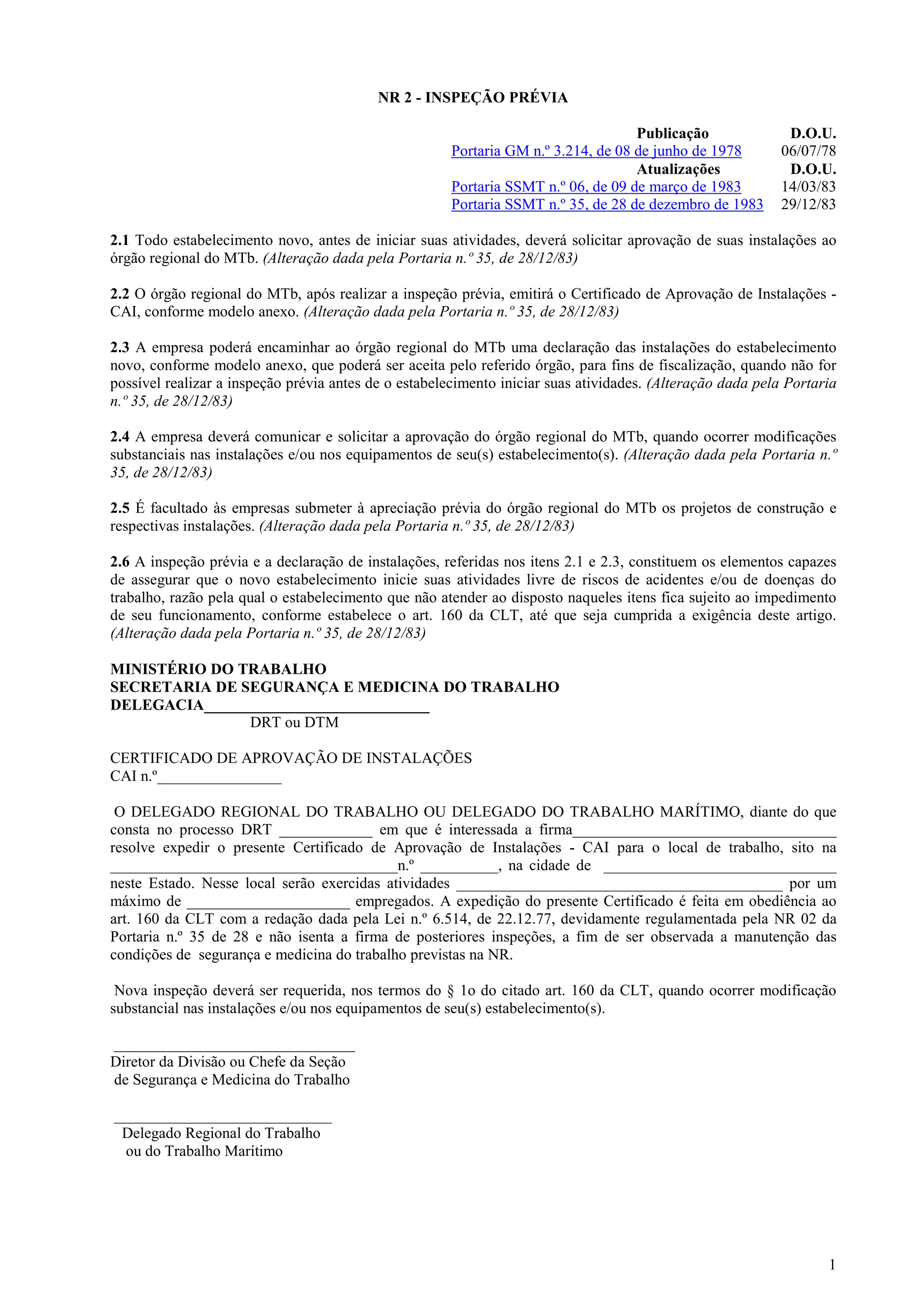 Este documento estabelece diretrizes para a inspeção prévia de instalações de novos estabelecimentos e comunicação de modificações, contendo 3 pontos principais: 1) Todo estabelecimento novo deve solicitar aprovação de suas instalações ao órgão regional do MTb antes de iniciar atividades; 2) Após inspeção, o órgão emitirá um Certificado de Aprovação ou aceitará uma Declaração de Instalações; 3) A empresa deve comunicar modificações substanciais nas instalações.