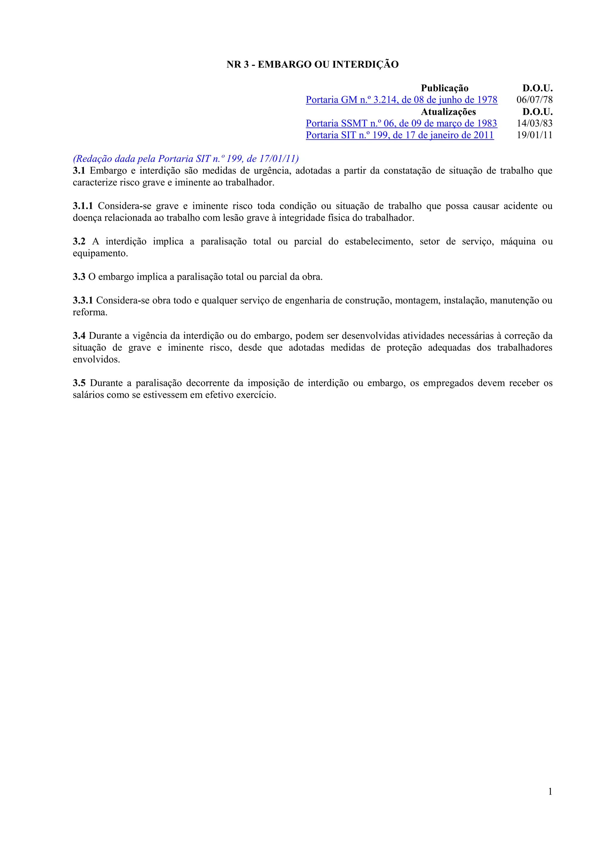 Este documento descreve medidas de embargo ou interdição que podem ser adotadas quando há risco grave e iminente aos trabalhadores. A interdição implica na paralisação total ou parcial de estabelecimentos ou equipamentos, enquanto o embargo implica na paralisação total ou parcial de obras. Durante a vigência das medidas, apenas atividades de correção com proteção adequada são permitidas, e os empregados devem continuar recebendo salários.