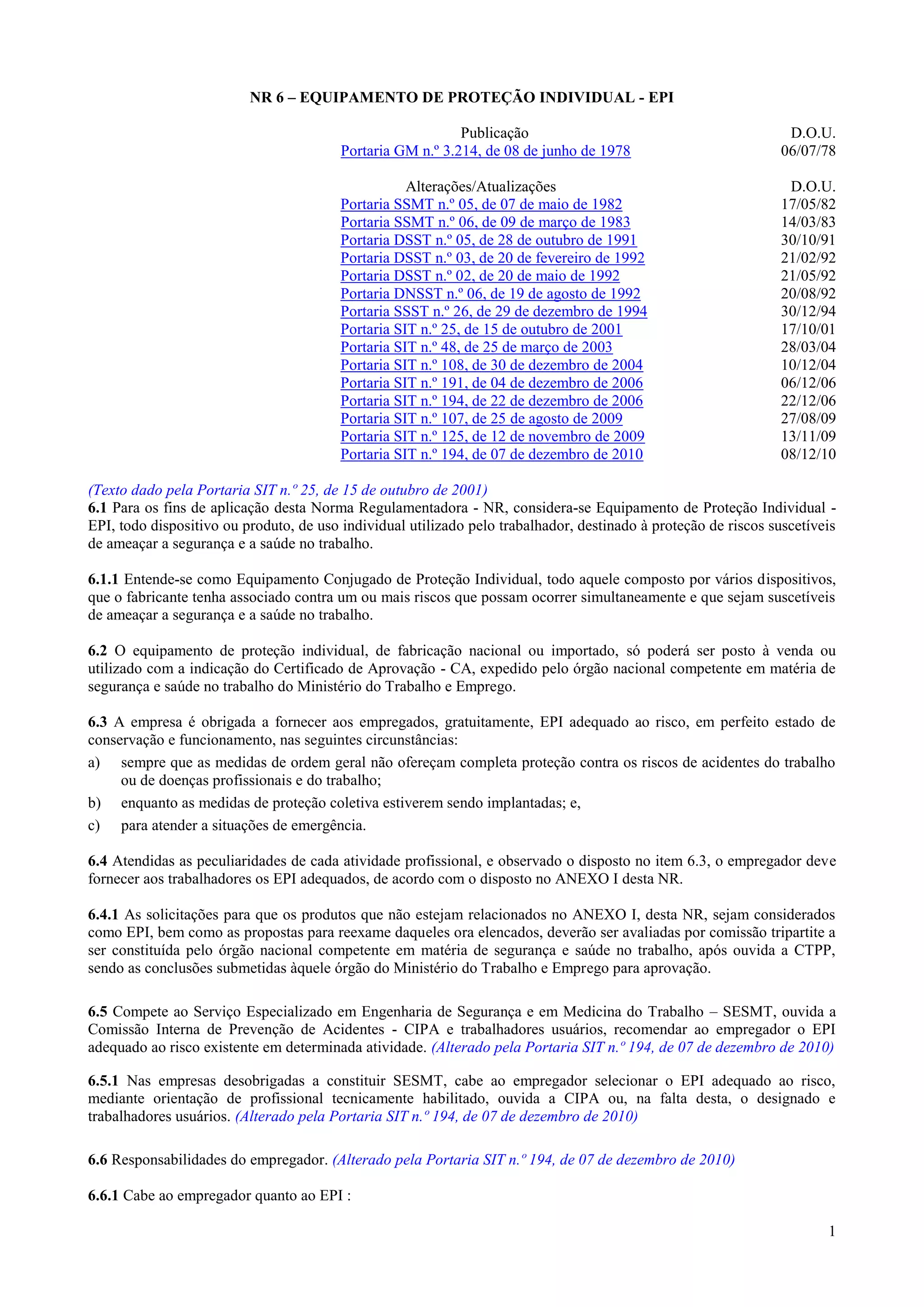 Este documento descreve as normas regulamentadoras sobre equipamentos de proteção individual no Brasil. Estabelece que os EPIs devem ser fornecidos gratuitamente pelo empregador sempre que houver riscos à saúde e segurança dos trabalhadores, e define as responsabilidades dos empregadores, trabalhadores, fabricantes e órgãos governamentais em relação aos EPIs.
