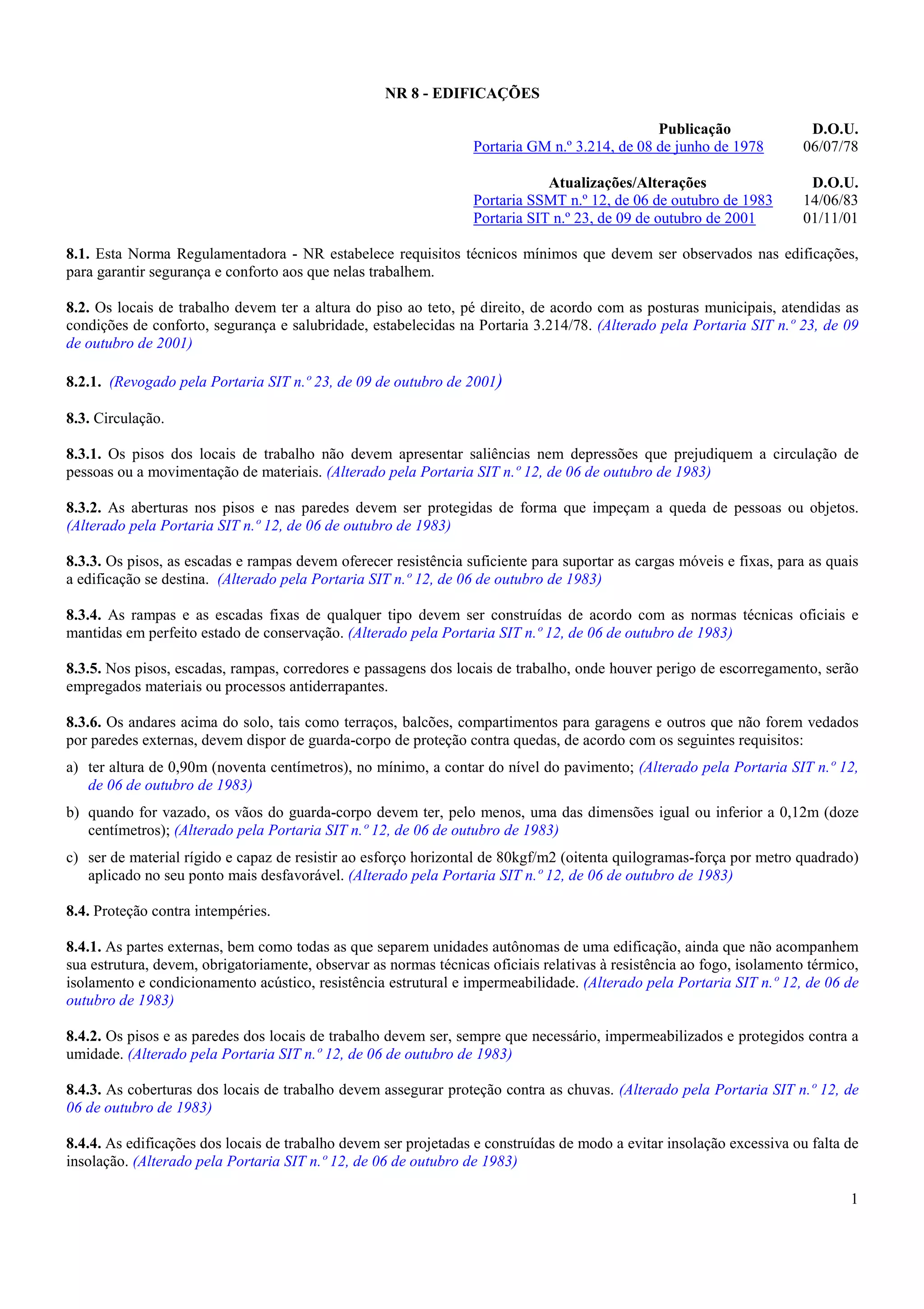 Este documento estabelece requisitos mínimos de segurança e conforto para edificações que garantam a segurança e bem-estar de trabalhadores. Ele cobre tópicos como altura mínima, circulação segura, proteção contra quedas, e proteção contra intempéries.
