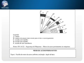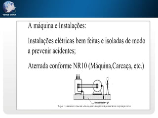 O documento resume as principais disposições de segurança estabelecidas na Norma Regulamentadora NR-12 sobre segurança em máquinas e equipamentos. Apresenta conceitos como princípio da falha segura e descreve requisitos de segurança para instalações elétricas, arranjo físico e disposições gerais de máquinas e equipamentos. Também fornece exemplos de medidas de proteção coletiva, administrativa e individual.