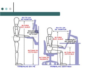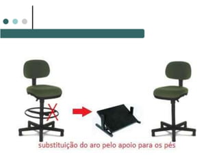 O documento discute os princípios da ergonomia no ambiente de trabalho, incluindo limites de peso para transporte manual de cargas, mobiliário e equipamentos ergonômicos, e organização do trabalho. Ele fornece diretrizes sobre pausas, enriquecimento de tarefas, controle do trabalhador sobre seu trabalho, e como a organização pode melhorar resultados e reduzir stress.