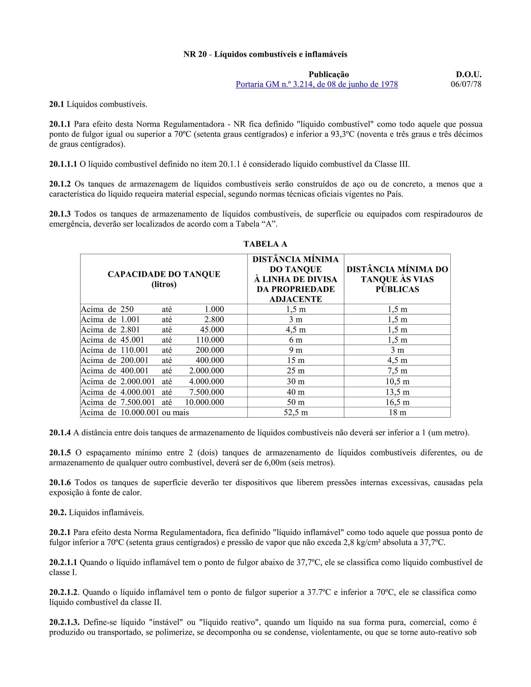 Este documento estabelece normas de segurança para armazenamento de combustíveis líquidos, inflamáveis e GLP. Define classes de combustíveis líquidos e requisitos para tanques de armazenamento, como distância mínima de divisas, vias públicas e entre tanques. Também especifica requisitos para armazenamento interno de combustíveis inflamáveis, como capacidade máxima de recipientes e características de salas de armazenamento.