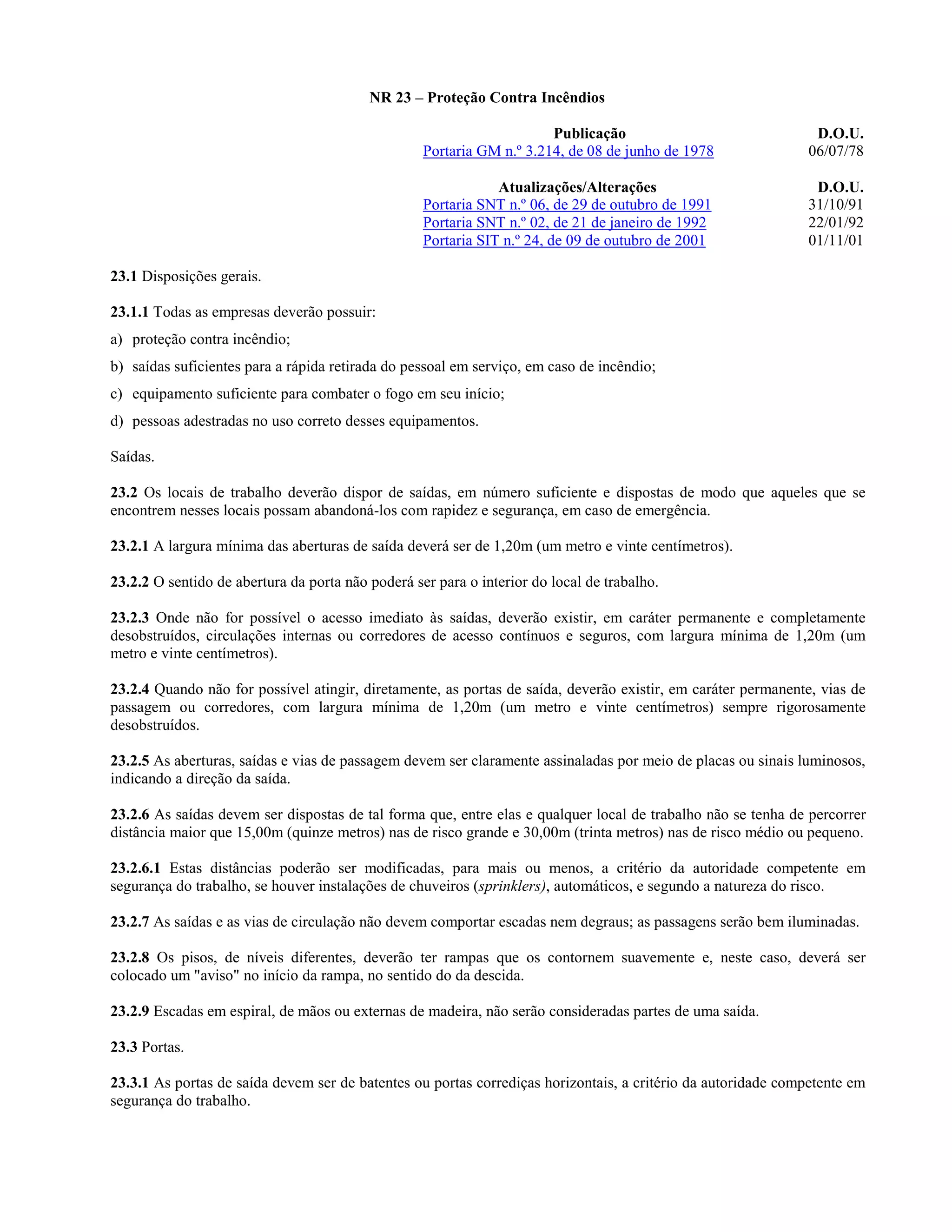 Este documento estabelece diretrizes de proteção contra incêndio em locais de trabalho, incluindo requisitos para saídas de emergência, combate ao fogo, equipamentos de extinção de incêndio e inspeções periódicas.