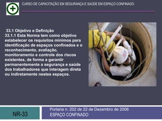 Este documento descreve os requisitos mínimos para identificação e gestão de riscos em espaços confinados de acordo com a Norma Regulamentadora NR-33. A norma estabelece as responsabilidades dos empregadores e trabalhadores, medidas técnicas, administrativas e pessoais para garantir a segurança e saúde dos trabalhadores em espaços confinados.