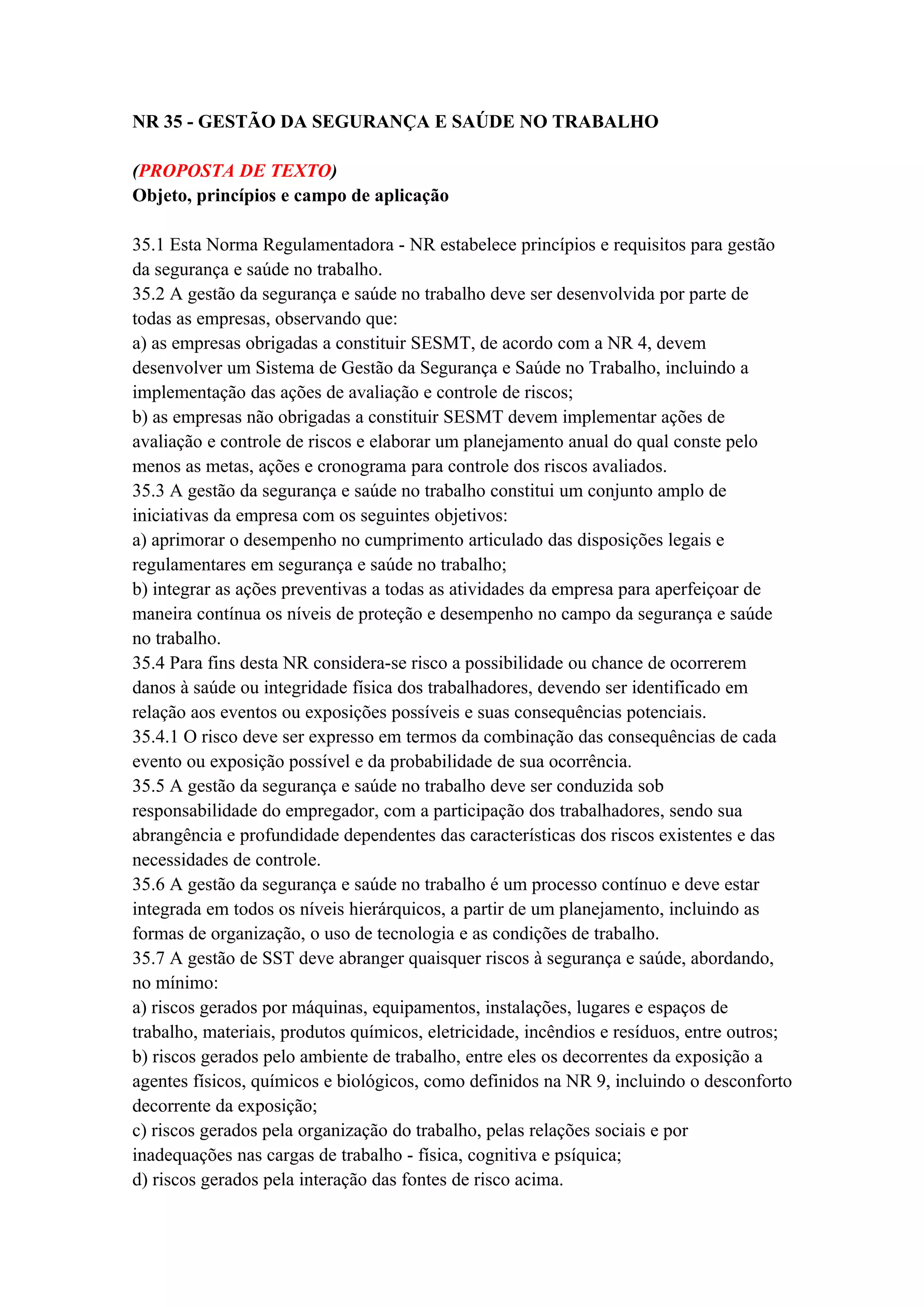 Esta norma regulamentadora estabelece princípios e requisitos para a gestão da segurança e saúde no trabalho, incluindo a avaliação e controle de riscos. Todas as empresas devem desenvolver ações de avaliação e controle de riscos, e as maiores devem implementar um Sistema de Gestão de Segurança e Saúde no Trabalho. A norma define os processos de identificação, análise e controle de riscos que as empresas devem seguir para proteger a saúde e segurança dos trabalhadores.