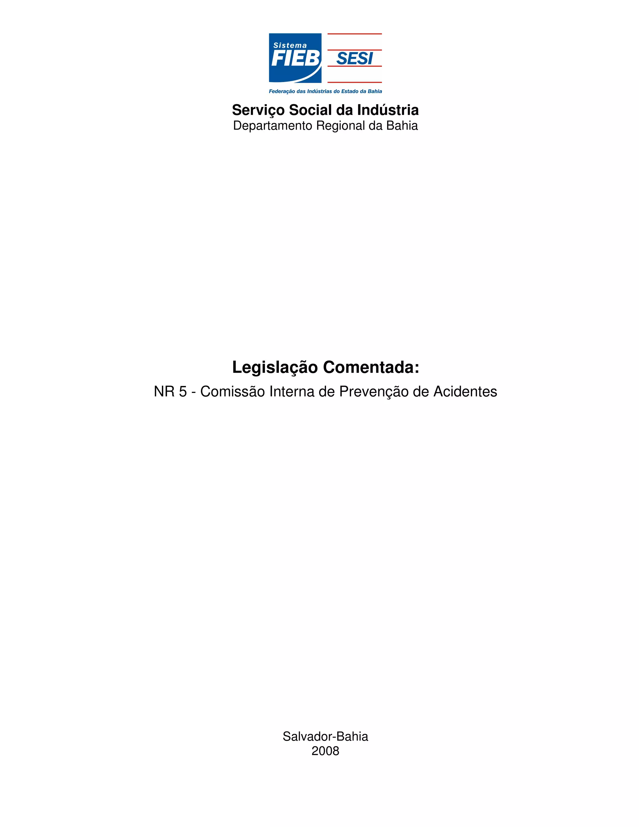Este documento apresenta informações sobre a Norma Regulamentadora NR 5 da legislação brasileira, que trata da Comissão Interna de Prevenção de Acidentes (CIPA). Ele contém um resumo da NR 5, uma lista de documentos complementares, perguntas e respostas comentadas sobre a norma, e comentários finais.