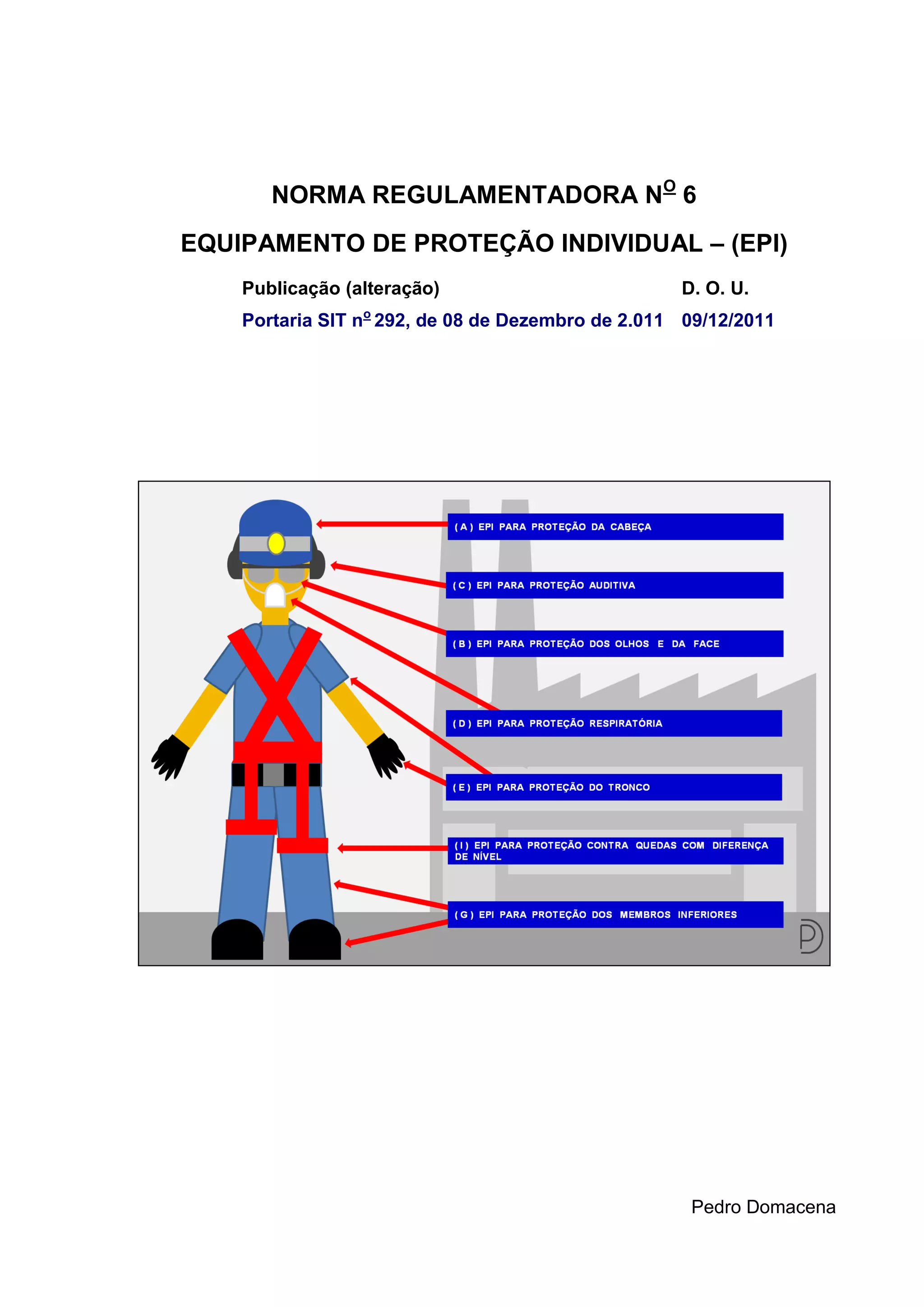 Este documento descreve a Norma Regulamentadora no 6 que estabelece regras sobre Equipamentos de Proteção Individual (EPI) no Brasil. A norma define EPI, exige certificação para comercialização e uso, e determina que empregadores forneçam gratuitamente EPI adequados aos riscos. A norma também estabelece responsabilidades de empregadores, trabalhadores e fabricantes em relação aos EPI.