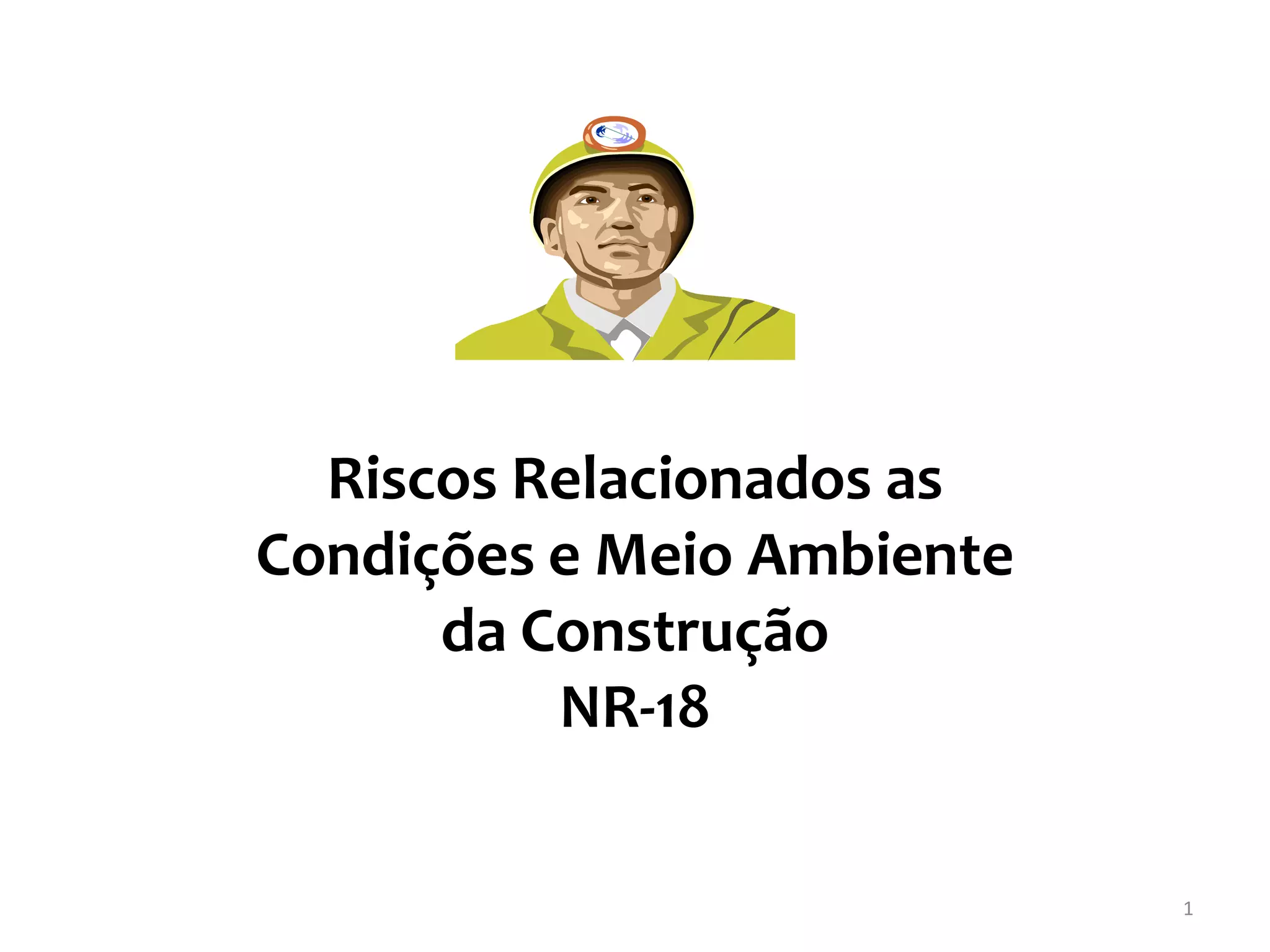 O documento discute os riscos relacionados às condições e meio ambiente da construção de acordo com a NR-18. Ele descreve que os acidentes na construção aumentaram acima da média entre 2004-2009 devido ao maior ritmo de atividade e contratação de mão de obra. As principais causas de acidente são quedas, soterramentos e choques elétricos. Ele também lista alguns riscos e medidas preventivas para escavações, fundações e desmonte de rochas.