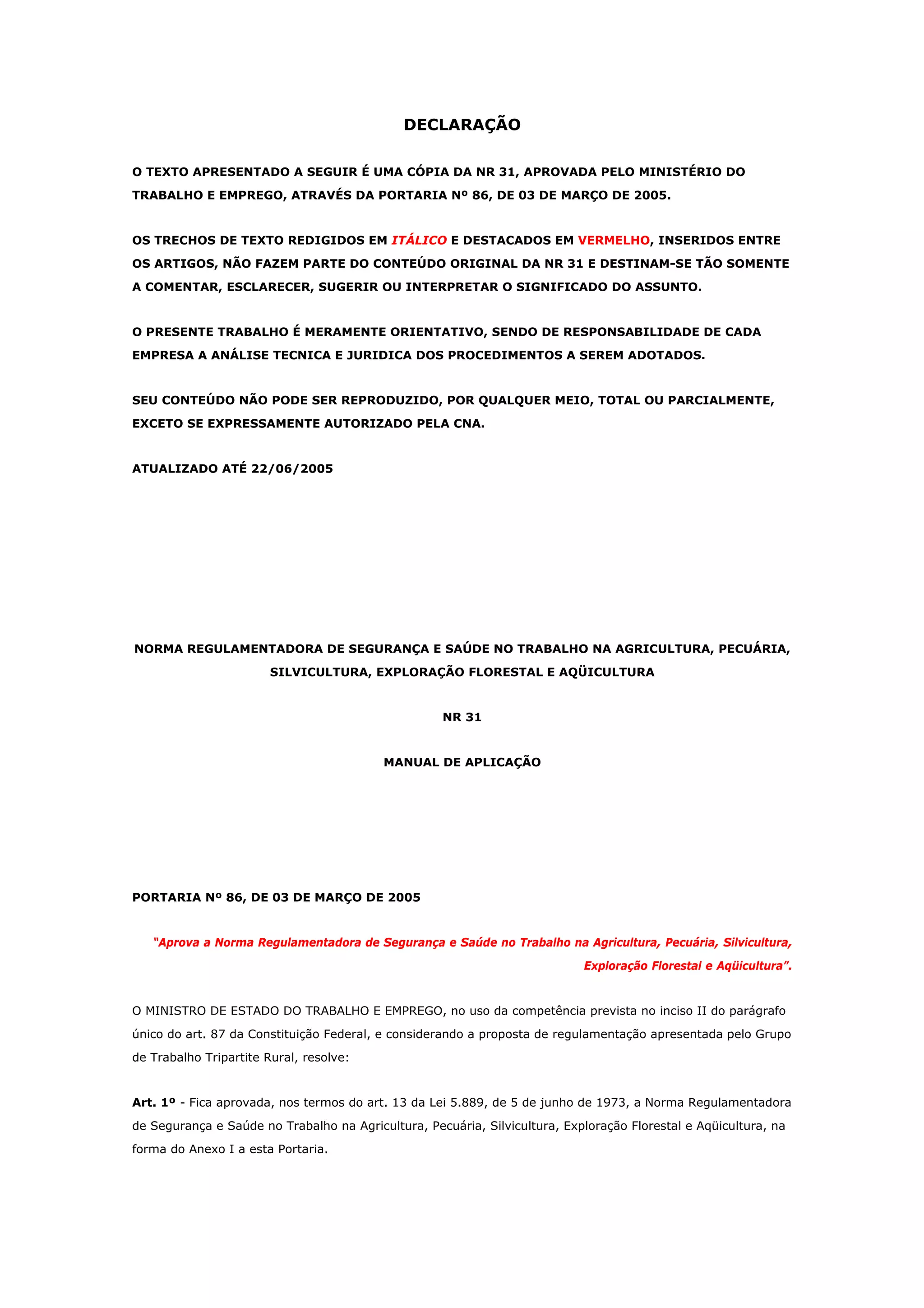 Este documento apresenta a Norma Regulamentadora de Segurança e Saúde no Trabalho na Agricultura, Pecuária, Silvicultura, Exploração Florestal e Aqüicultura (NR 31), aprovada pelo Ministério do Trabalho e Emprego em 2005. A NR 31 estabelece as obrigações dos empregadores rurais para garantir condições de trabalho seguras e saudáveis. Compete ao empregador realizar avaliações de riscos, adotar medidas de prevenção, promover melhorias nas condições de trabalho e asseg