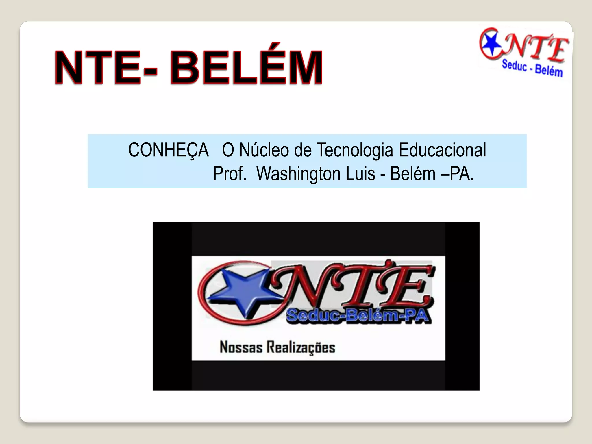 O documento fornece um resumo das atividades e serviços oferecidos pelo Núcleo de Tecnologia Educacional Prof. Washington Luis em Belém do Pará. O NTE oferece cursos de formação continuada para professores, assessoria pedagógica às escolas e formação de estudantes em tecnologias digitais. O documento detalha a história do NTE, sua equipe, escolas atendidas, cursos e mini-cursos oferecidos.