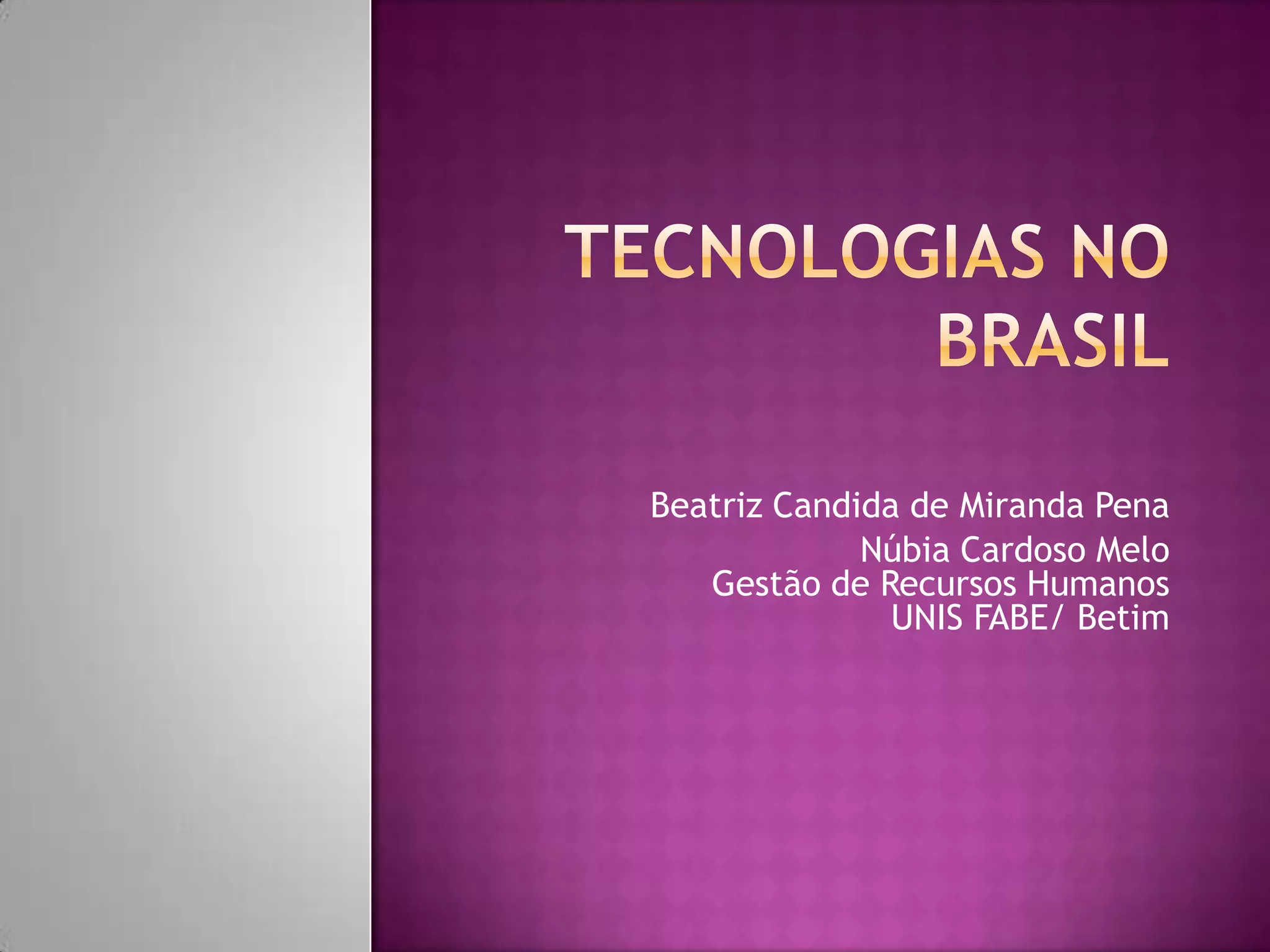 O documento discute a evolução da tecnologia no Brasil desde a década de 1970, incluindo o desenvolvimento da informática, tecnologias de gestão, inclusão digital, tecnologias assistivas e sociedade da informação, concluindo com uma breve discussão sobre o comércio eletrônico.