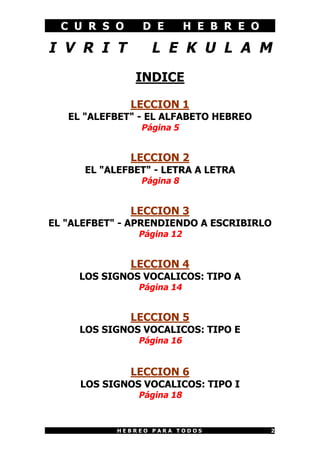 Este documento presenta las primeras 20 lecciones de un curso de hebreo. Cada lección cubre un tema diferente como el alfabeto hebreo, los signos vocálicos, sustantivos, verbos y conversaciones básicas. Al final de cada lección hay un vocabulario relevante al tema cubierto.