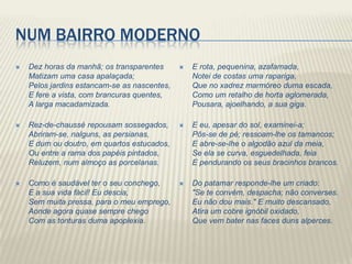 O poema descreve a deambulação do sujeito poético por um bairro moderno de Cesário Verde, onde observa diferentes personagens e cenas do cotidiano. Seu olhar metamorfoseante transforma os vegetais carregados por uma regateira em partes do corpo humano. A oposição entre a cidade e o campo é evidenciada através do tratamento dado às personagens.