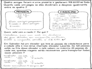 O documento discute conceitos básicos de matemática como adição, subtração, multiplicação e divisão. Inclui exemplos de como ensinar estas operações a crianças de forma lúdica e progressiva, utilizando atividades, jogos e a calculadora. Também aborda propriedades destas operações como comutatividade e distribuição.