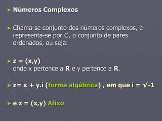 O documento discute números complexos, definindo-os como pares ordenados (x,y) onde x pertence aos números reais e y também pertence aos números reais. z é representado da forma x + y.i, onde i = √-1. As operações como adição, subtração, multiplicação e divisão com números complexos seguem regras específicas.