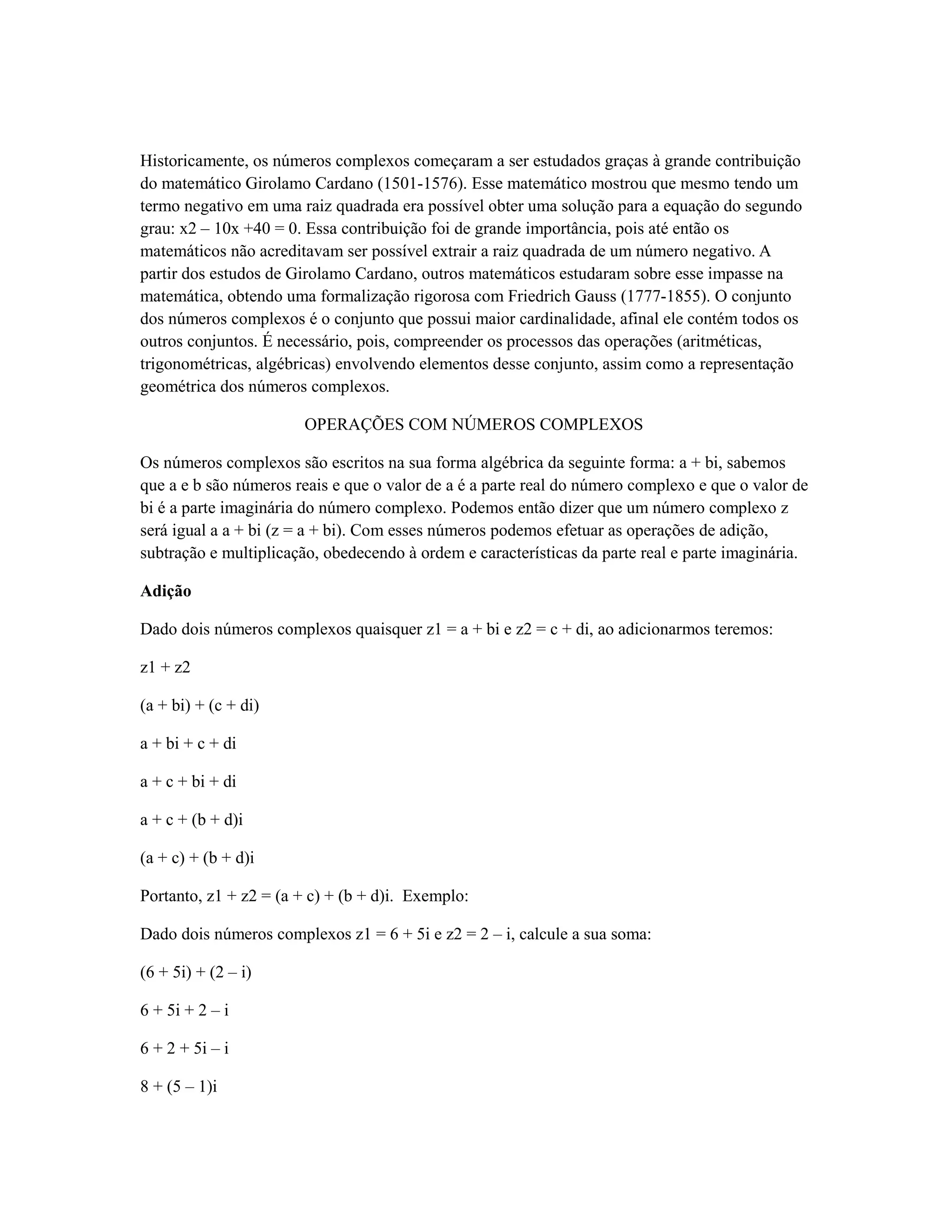 Os números complexos começaram a ser estudados graças a Girolamo Cardano, que mostrou ser possível extrair raízes de números negativos. Posteriormente, matemáticos como Gauss formalizaram os números complexos de forma rigorosa. As operações com números na forma a + bi obedecem regras específicas para as partes real e imaginária.