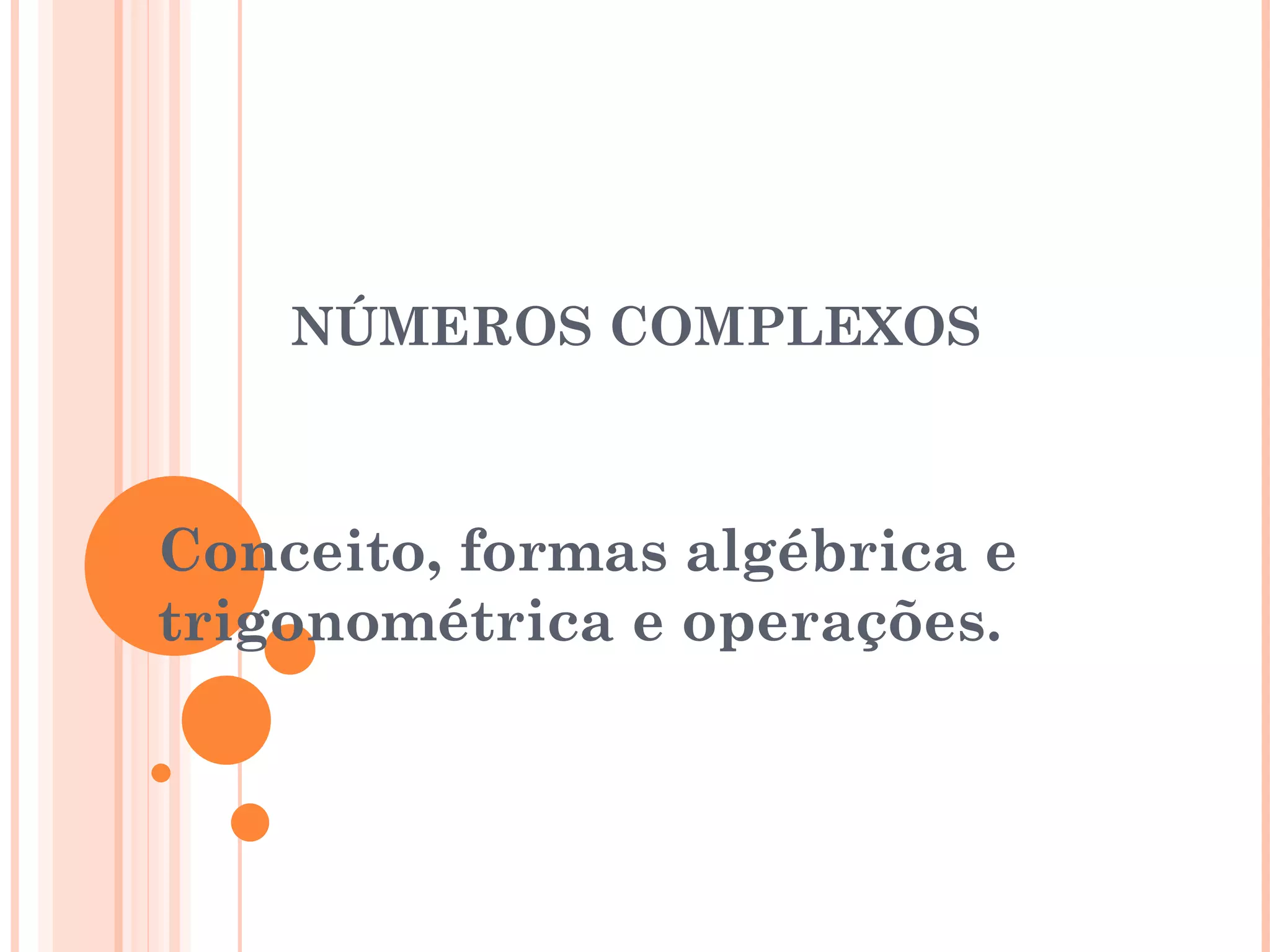 O documento apresenta os conceitos básicos dos números complexos, incluindo sua forma algébrica e trigonométrica e operações com esses números. Aborda a definição de números complexos para resolver equações do tipo x2 = -1, sua representação na forma a + bi, operações como adição, subtração, multiplicação e divisão, além de apresentar a representação geométrica desses números no plano complexo.