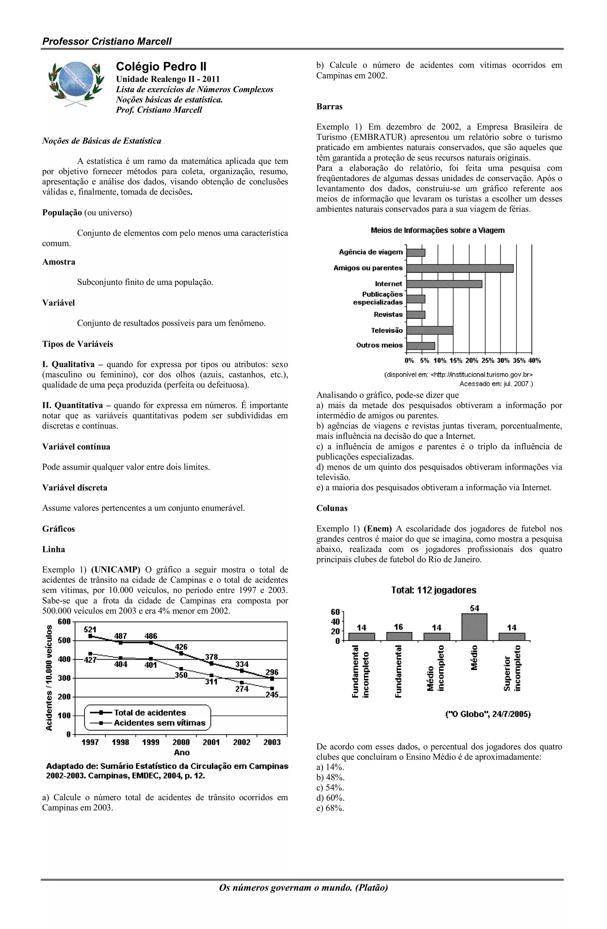 I. O documento apresenta noções básicas de estatística, incluindo definições de população, amostra, variáveis e tipos de gráficos.