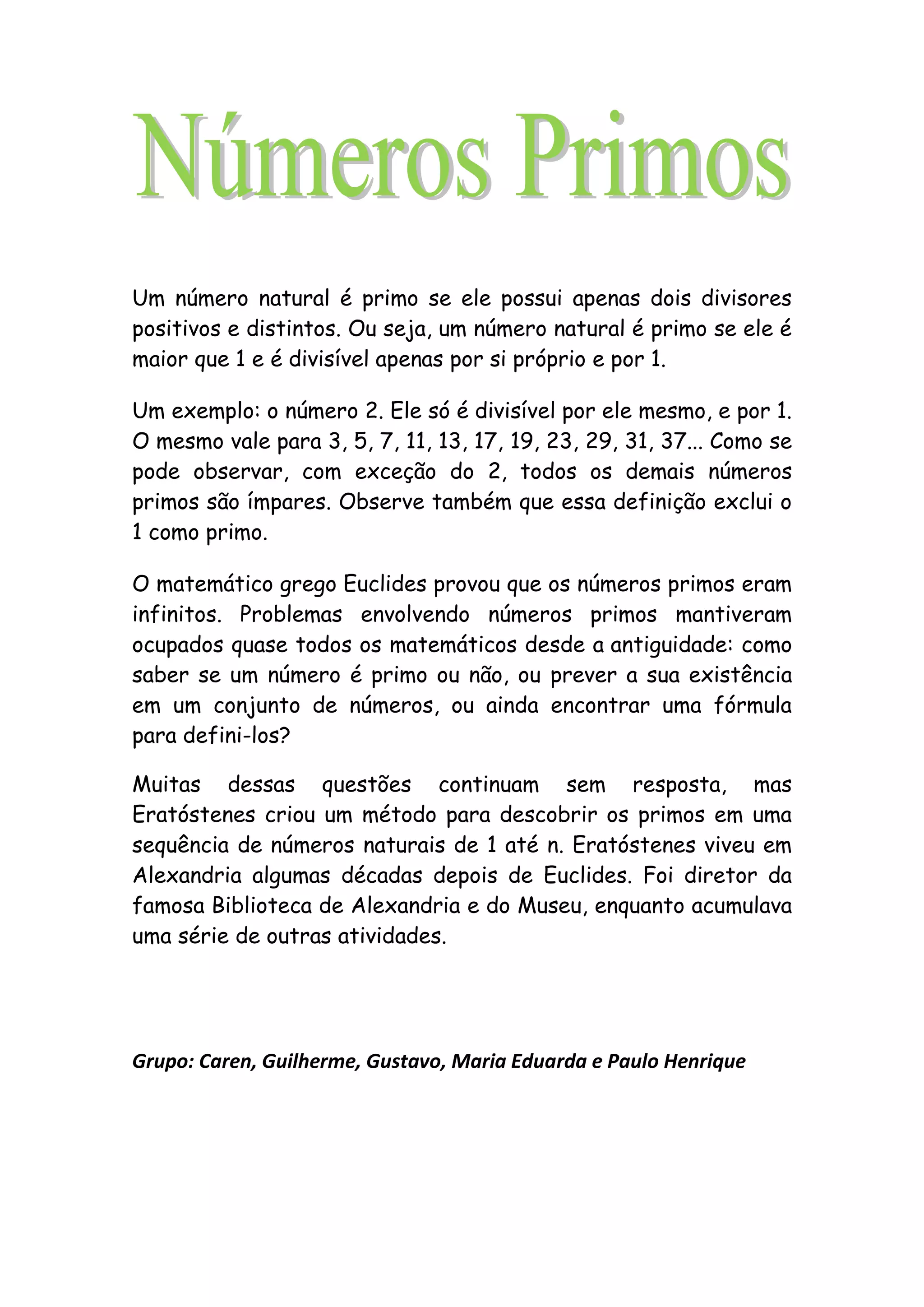 Um número natural é considerado primo se tiver apenas dois divisores positivos e distintos, que são ele mesmo e 1. Os números primos são infinitos e seu estudo é importante na matemática. Eratóstenes desenvolveu um método para identificar números primos em uma sequência.