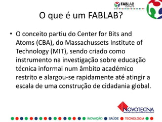 O documento descreve o conceito de FABLAB, laboratórios de fabricação digital que fornecem ferramentas para prototipagem rápida através de software e hardware de código aberto. Os FABLABs apoiam projetos de empreendedorismo, pesquisa e desenvolvimento e educação técnica através do aprendizado prático.