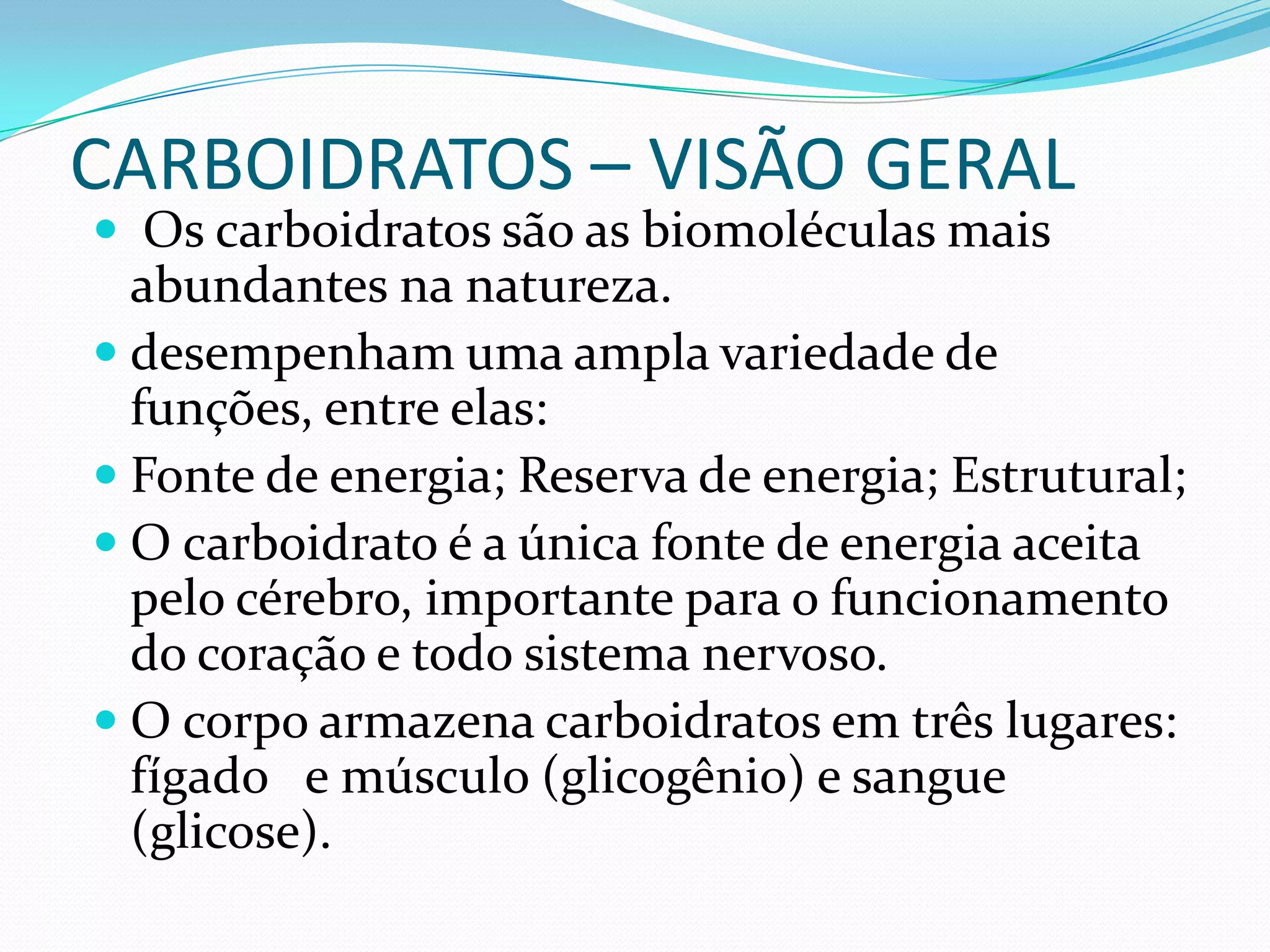 O documento discute os principais macronutrientes - carboidratos, proteínas, lipídios, vitaminas e sais minerais. Carboidratos fornecem energia para o cérebro e coração. Proteínas são essenciais para a estrutura e função celular. Lipídios armazenam energia e compõem membranas celulares. Vitaminas e sais minerais desempenham papéis importantes no corpo.