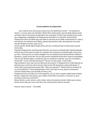 Chapeuzinho Vermelho descobre queimadas na floresta e encontra um lobo assustado fugindo do fogo. Ela leva o lobo para casa da vó para se recuperar. Ao contarem o que viram, a vó liga para o guarda florestal, mas ele tenta encobrir a verdade. Eles investigam e descobrem latifundiários desmatando ilegalmente com a ajuda do guarda. Todos são presos, mas a luta pela proteção da natureza continua.