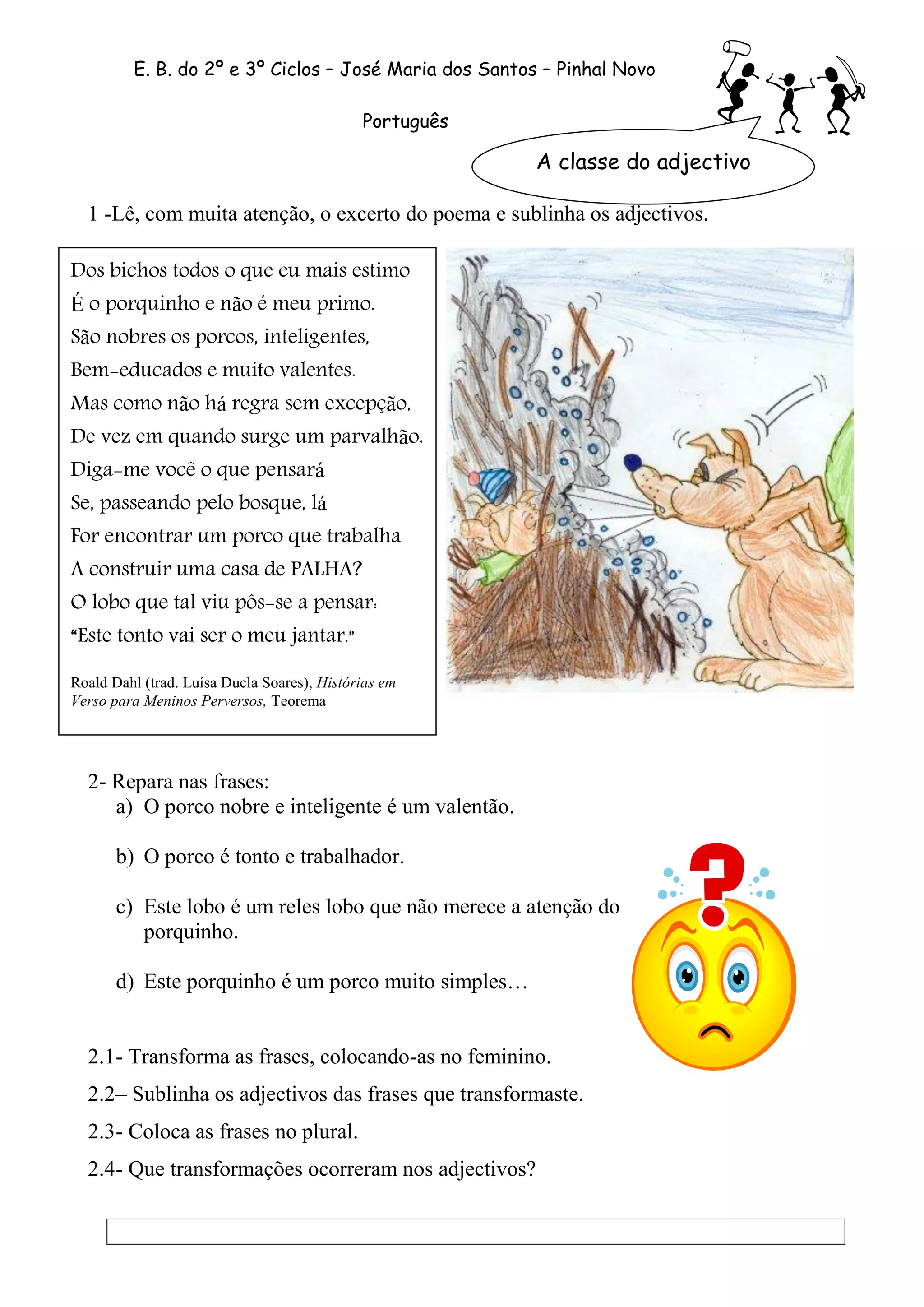 Este documento fornece instruções sobre a classe gramatical do adjetivo em português. Explica como os adjetivos variam de gênero e número de acordo com os nomes que qualificam, e apresenta os diferentes graus do adjetivo: positivo, comparativo e superlativo. Também fornece exemplos de exercícios para identificar e empregar corretamente os adjetivos e seus graus.
