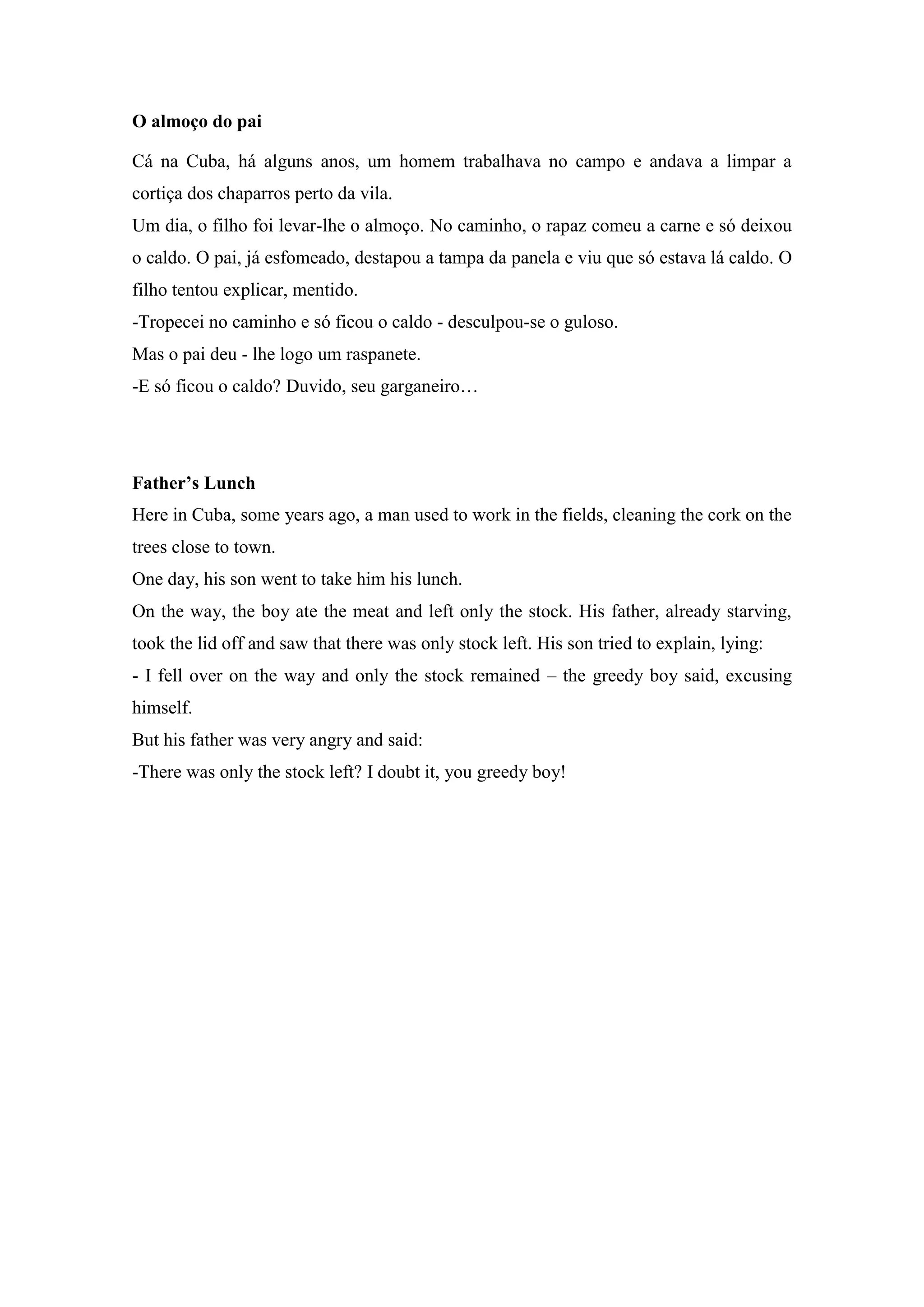 o caldo. O pai, já esfomeado, destapou a tampa da panela e viu que só estava lá caldo. O