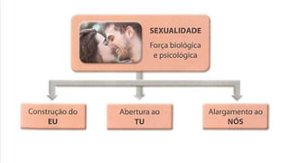 Este documento discute o amor, sexualidade e família. Ele descreve o amor como a força mais poderosa que distingue os seres humanos e é vital para a sobrevivência. A adolescência é quando as amizades e primeiras paixões surgem. A sexualidade é fundamental para estabelecer laços com os outros. A família é a primeira célula da sociedade onde a vida é gerada e as crianças são educadas.