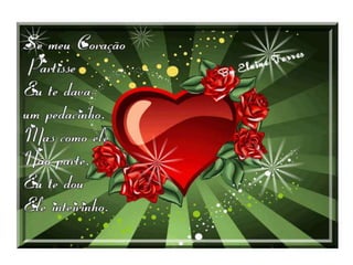 Este documento é uma declaração de amor profunda e apaixonada, expressando sentimentos intensos e a importância da pessoa amada na vida do autor. Ele destaca a felicidade, a paz e o desejo de estar sempre juntos, evidenciando o amor verdadeiro e eterno. O autor enfatiza que a conexão entre os dois corações é essencial e que sua vida é completa com a presença da amada.
