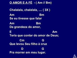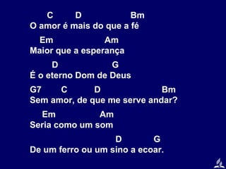 O documento descreve o amor de Deus e como Ele levou Seu filho à cruz para morrer em nosso lugar. O amor é maior que a fé e a esperança e é o eterno dom de Deus. Sem amor, não há propósito em viver.