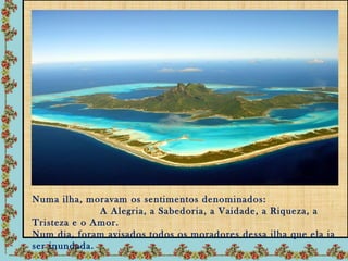 O documento conta a história de vários sentimentos moradores de uma ilha que vai ser inundada. Quando a água começa a subir, o Amor pede ajuda aos outros sentimentos para escapar, mas é rejeitado por todos exceto o Tempo, que o salva levando-o em seu barco para a outra ilha. A Sabedoria explica ao Amor que só o Tempo pode ajudar e compreender um grande Amor.