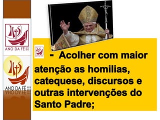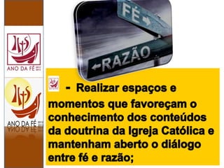 O Ano da Fé, convocado pelo Papa Bento XVI, visa a uma renovada conversão ao Senhor e ocorreu de 11 de outubro de 2012 a 24 de novembro de 2013, para celebrar o 50º aniversário do Concílio Vaticano II e o 20º do Catecismo da Igreja Católica. Durante este período, destaca-se a importância de aprofundar a fé e a participação ativa na liturgia, enfatizando a necessidade de redescobrir os conteúdos da fé e o testemunho cristão. O documento também lembra que a fé deve ser vivida e professada com convicção, tal como os primeiros cristãos, que a compartilhavam com confiança e coragem.